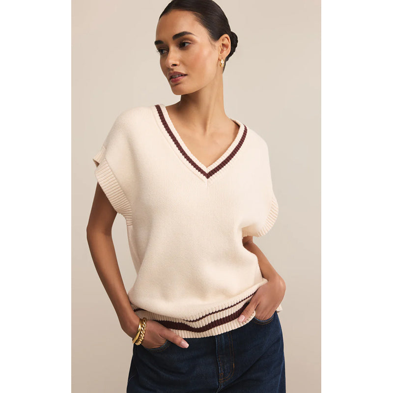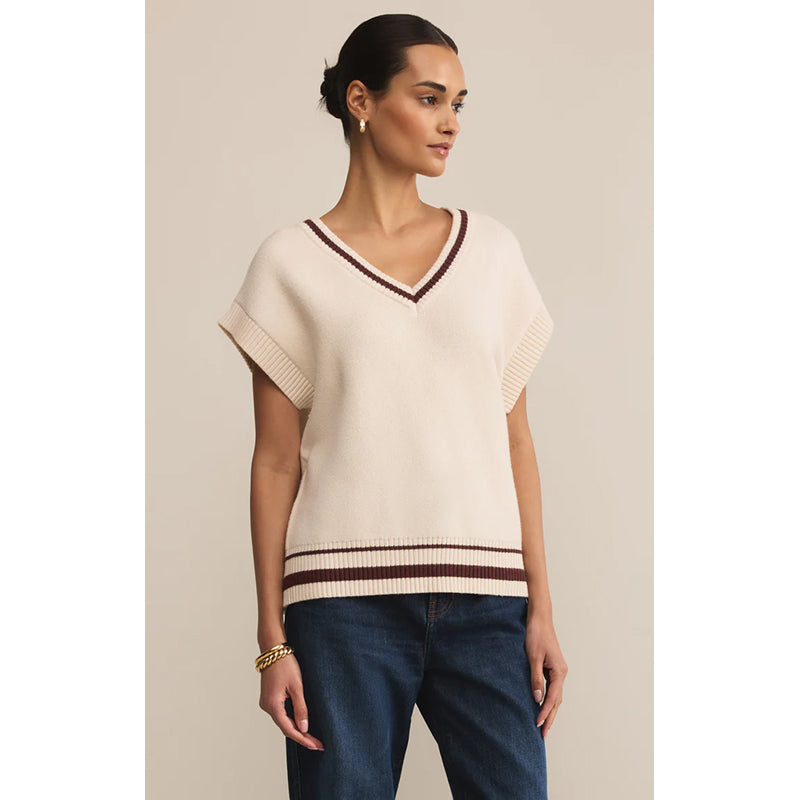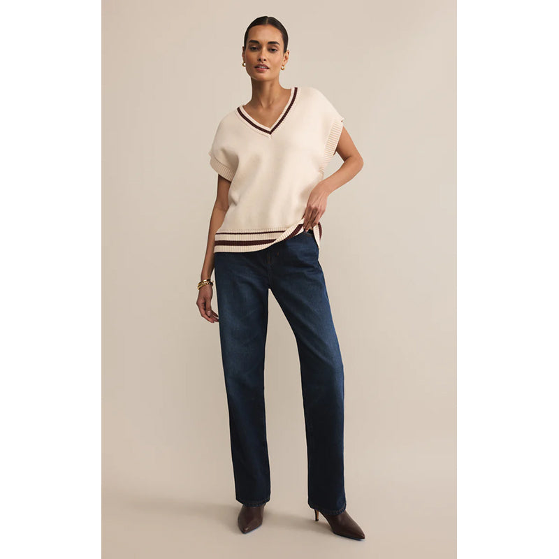 This jacquard knit vest, inspired by varsity style, showcases textured fabric with contrasting stripes and a flattering v-neck. Crafted from our rich jacquard material, it offers a comfortable midweight feel, perfect for layering over your favorite button-up paired with jeans or casual pants.
