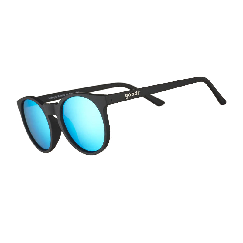Hipster-inspired round blue lens sunglasses worth rambling about. Fashionable black retro round frames meet functional polarized lenses with/ UV400 protection. Go ahead and get sweaty– the special grip coating and snug, lightweight fit means they won’t slip or bounce.