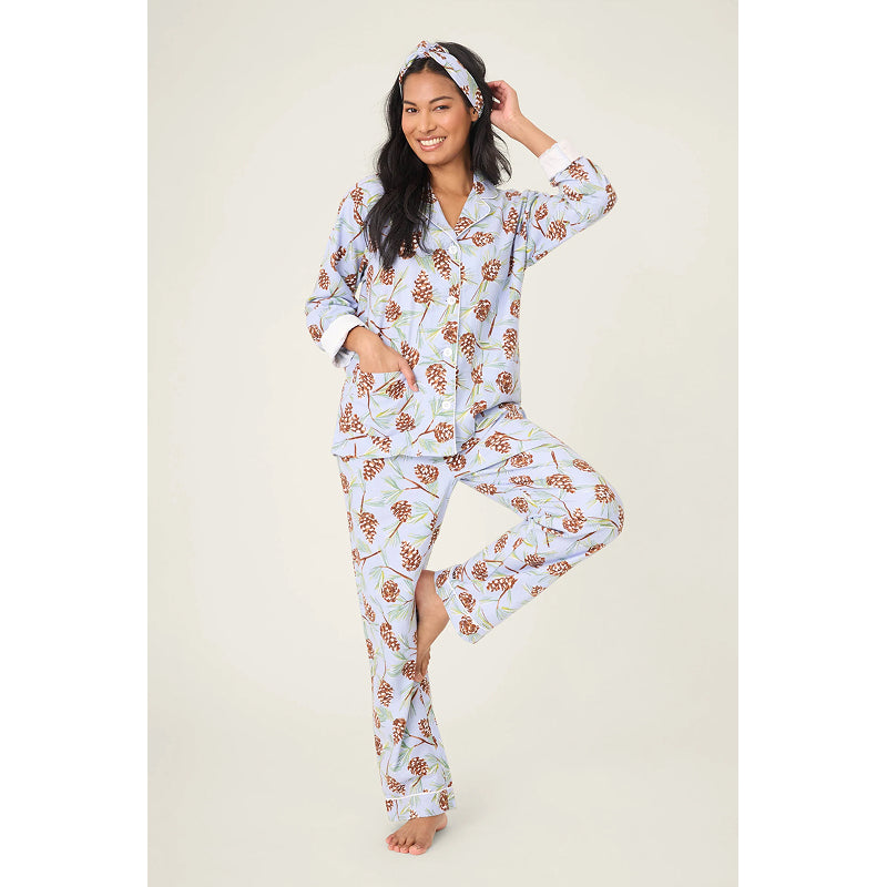 Women’s blue flannel pajama set with pinecone print, button front top, drawstring pants, and matching headband.