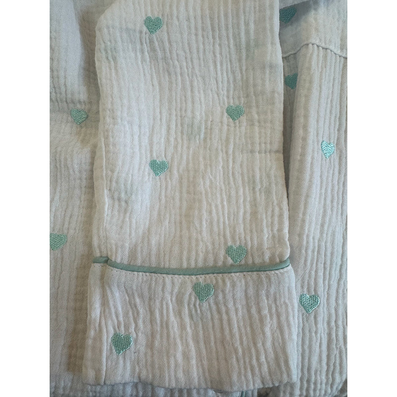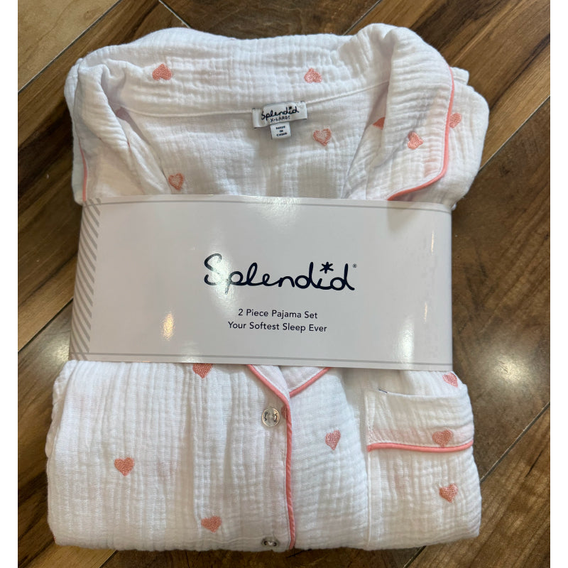 Introducing the Splendid Lottie Love Short Set! This irresistible set features a notch collar shirt with long sleeves, front button closures, and contrast piped trims. Complete with a left chest patch pocket and shorts with a drawstring waistband and pull-on style, this set is adorned with charming heart embroidery throughout. Perfect for those who are passionate about comfort and style.