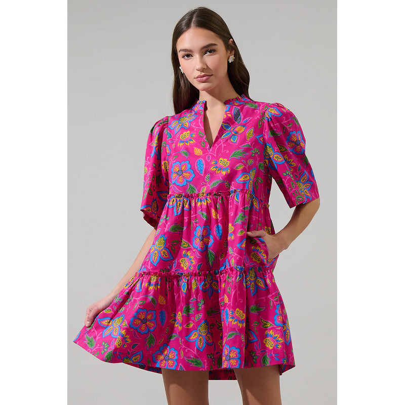 She’s back! A multi floral print mixed with silhouette style motifs decorate a playful mini dress with a split neckline that's framed by gathered short sleeves. It maintains an A line frame with ruffle lined tiers. Add on heels or sandals for a complete look. - Breathable - Shift dress - Pockets - Split neckline