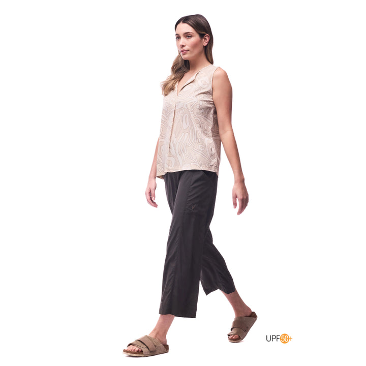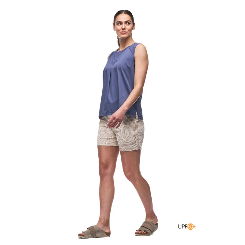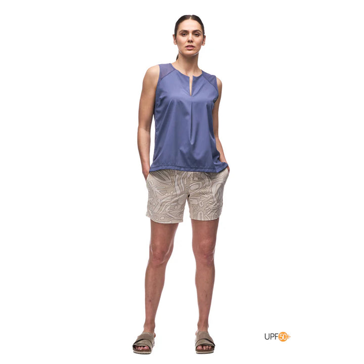 The Indyeva Steek II Sleeveless Shirt features mesh inserts at the shoulder, a front pleat, and a v-notch collar. Its lightweight, airy design makes it an excellent choice for both daytime outdoor adventures and evening outings. With a loose fit and hip-length, this top is suitable for a variety of activities including strolls in the woods, day hikes, long hikes, casual wear, and travel.