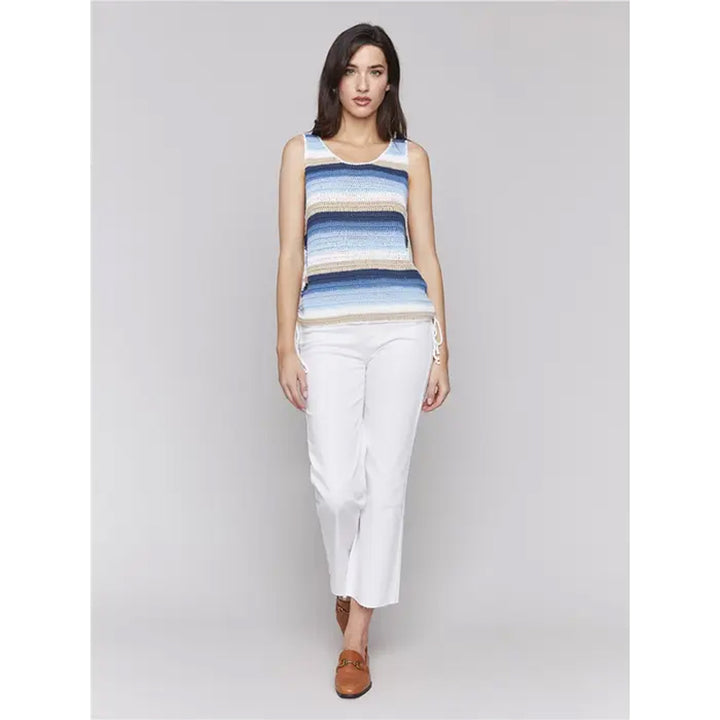 Le haut sans manches en crochet Charlie B apporte une touche d'élégance à toutes vos tenues. Avec ses liens latéraux et ses rayures dégradées, il offre un look unique et accrocheur. Fabriqué en 100 % acrylique, il offre douceur et confort. Mesurant 56 cm de long au dos, il est parfait en toute occasion.
