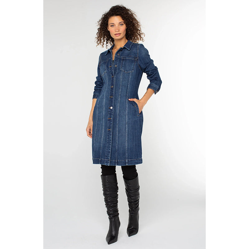 The Long Trucker Jacket in Centerbrooke wash features a sleek longline design that enhances any outfit with added shape and adaptability. Its deep indigo shade makes it a perfect layering piece, complementing dresses, jeans, or tailored pants with ease.