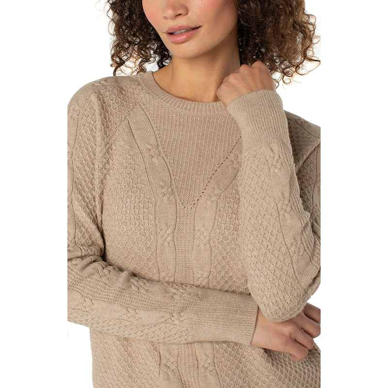 This raglan-sleeve sweater is defined by its timeless cable knit detailing and clean crew neckline. Soft and versatile, it layers effortlessly over shirting or stands alone with denim and trousers—an easy staple for cooler days.
