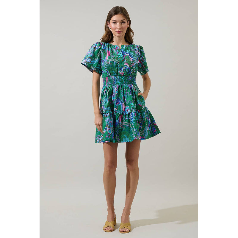 Grab and go in this effortless and versatile dress. A cute floral print decorates this mini dress with short sleeves and split neckline. The smocked waist tops a ruffle tier layer to a mini skirt. Green or white strappy heels go perfectly with this dress. - Puff short sleeve - Cotton - Smocked waist - Mini