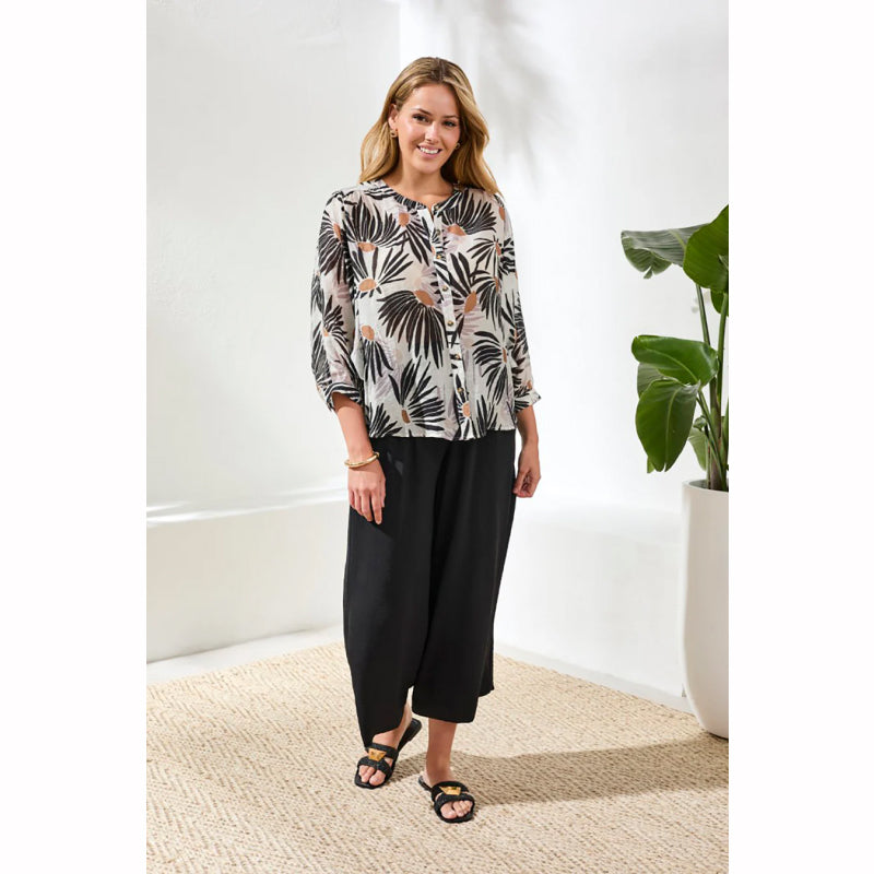 Flottez sans effort d'un endroit à un autre avec notre chemisier fluide à manches dolman tribal. Le tissu luxueusement tissé, l'imprimé élégant et l'encolure crantée avec boutons recouverts de tissu offrent une respirabilité élégante et une touche de luxe. Parfait pour la femme avant-gardiste en déplacement !