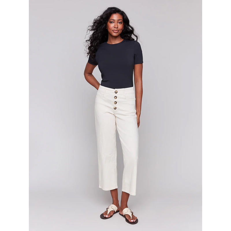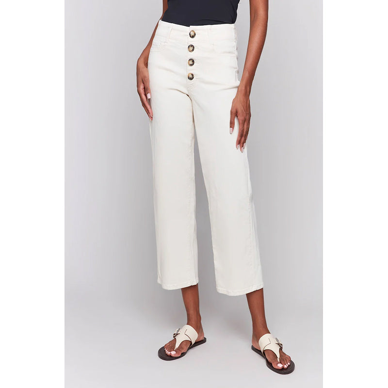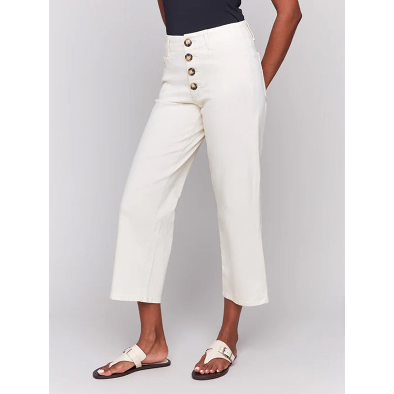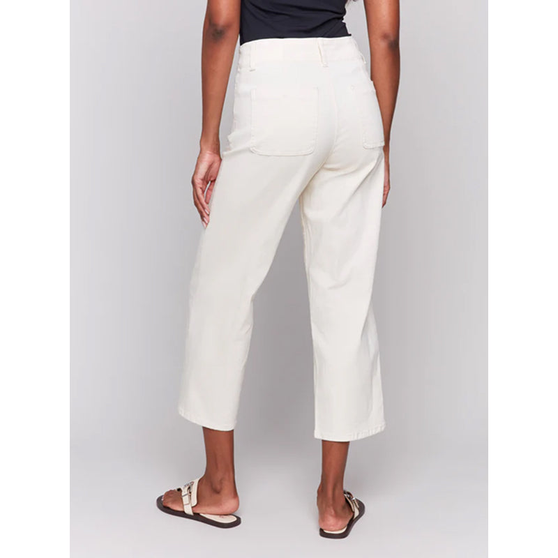 Enhance your wardrobe with these timeless white natural crop twill pants. The modern front button-fly adds a stylish edge, while the flattering cropped straight leg design elevates your look. Perfect for pairing with sneakers or sandals, these jeans exude effortless elegance for all your spring and summer ensembles.