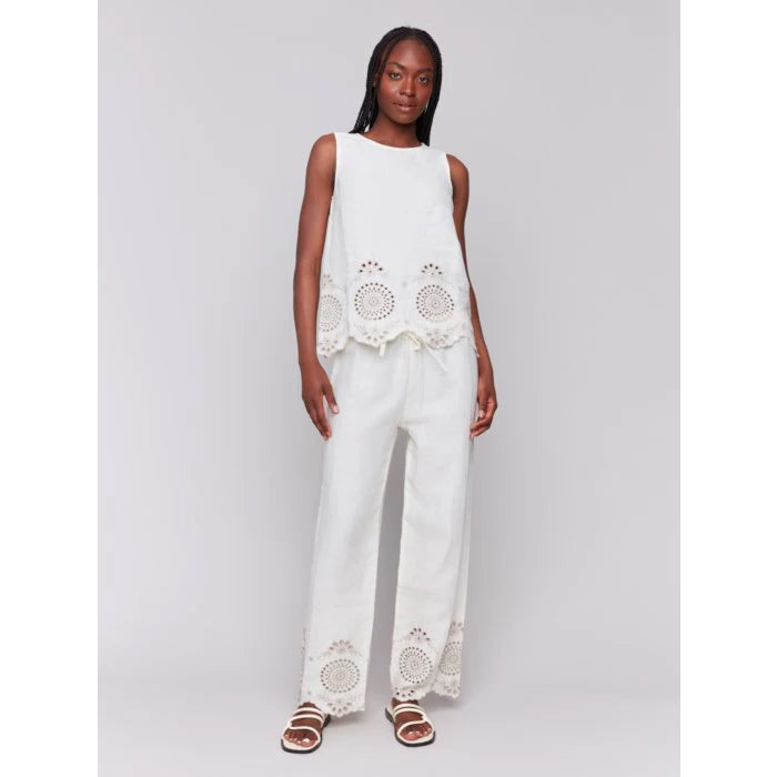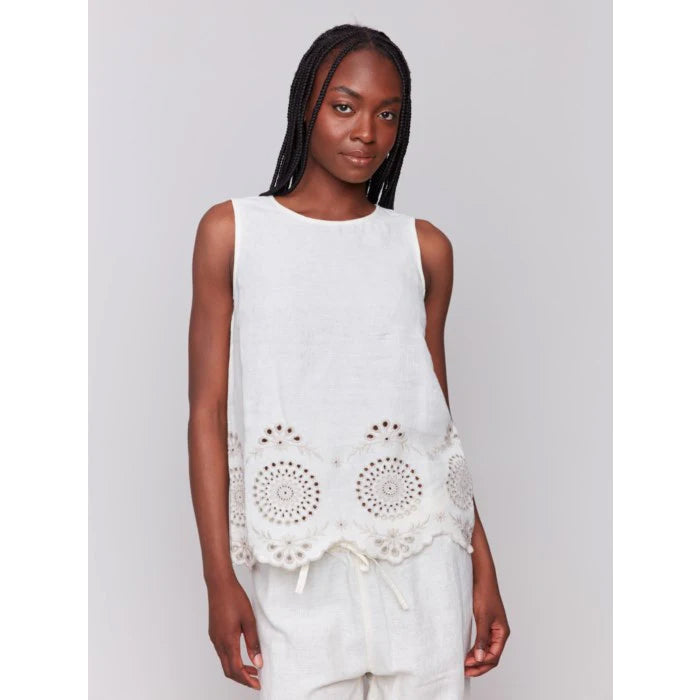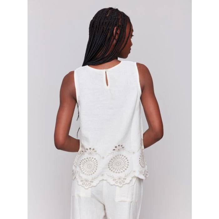 Enhance your wardrobe with the Charlie B Sleeveless Embroidered Cotton Top, featuring a 100% linen construction and a back length of 25". Keep your top looking fresh by washing it at delicate in cold water, avoiding bleach, and drying it by hanging. For the best results, use a low setting when ironing or opt for dry cleaning if necessary.