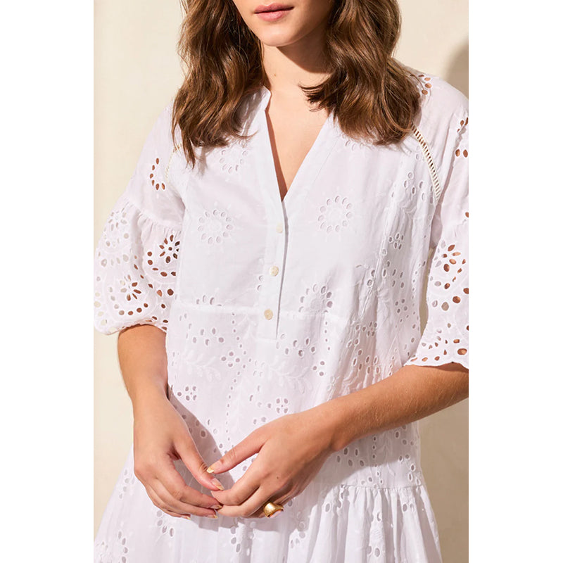 Delicate eyelet details bring charm to this relaxed dress, featuring a tiered skirt and ruffle-finished short sleeves. Buttoned accents let you adjust the notch neckline, while breathable cotton ensures lasting comfort.
