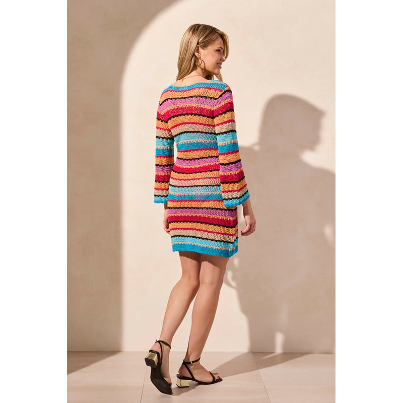 Experience effortless beach style with this vibrant striped cover-up made from a breathable mesh knit that ensures your swimsuit dries quickly. The v-neckline is adorned with a charming tie detail, and the three-quarter length bell sleeves offer just the right amount of coverage.